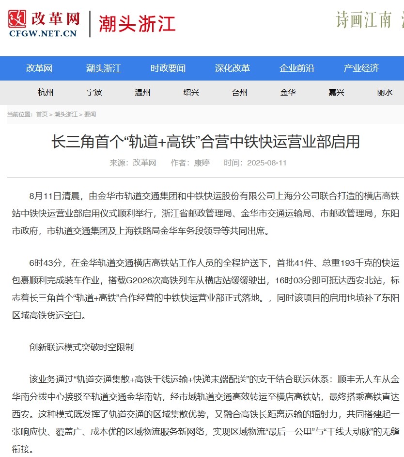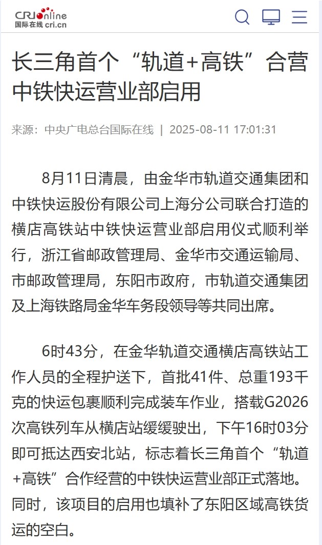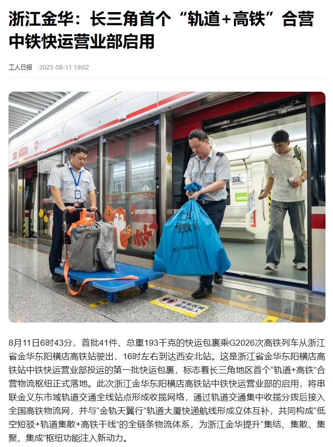 8月11日,長三角首個“軌道+高鐵”合營中鐵快運營業部啟用。該營業部將串聯金義東市域軌道交通全線站點形成收攬網絡,在全線31座車站均可辦理業務,通過軌道交通集中收攬分撥后接入全國高鐵物流網。