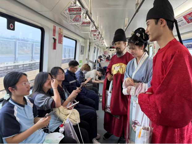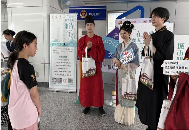 李清照、宋濂、駱賓王和艾青四位詩人“穿越”而來,他們在站臺及車廂內(nèi)與乘客互動,進行詩詞接龍、知識問答,引發(fā)打卡熱潮,帶來“軌道交通浪漫詩會”的沉浸式體驗!